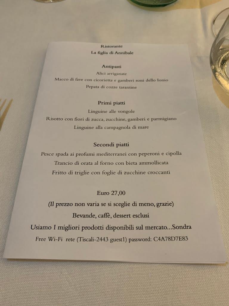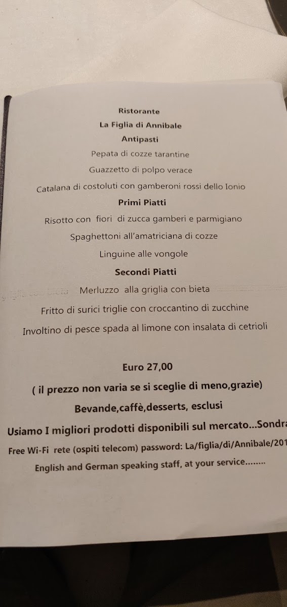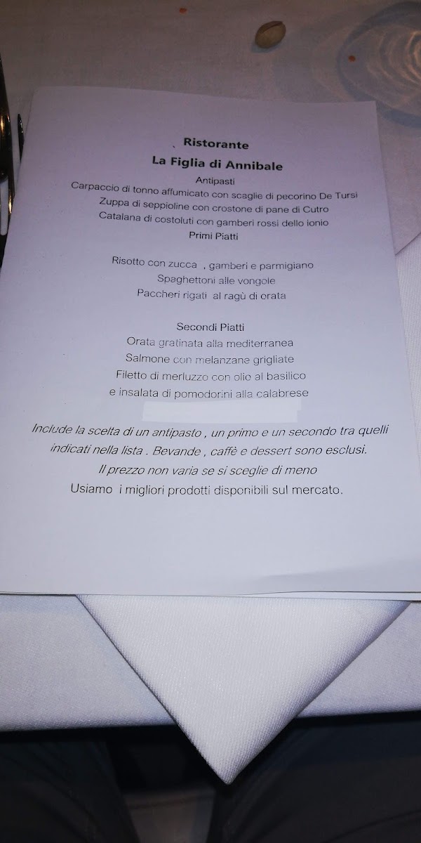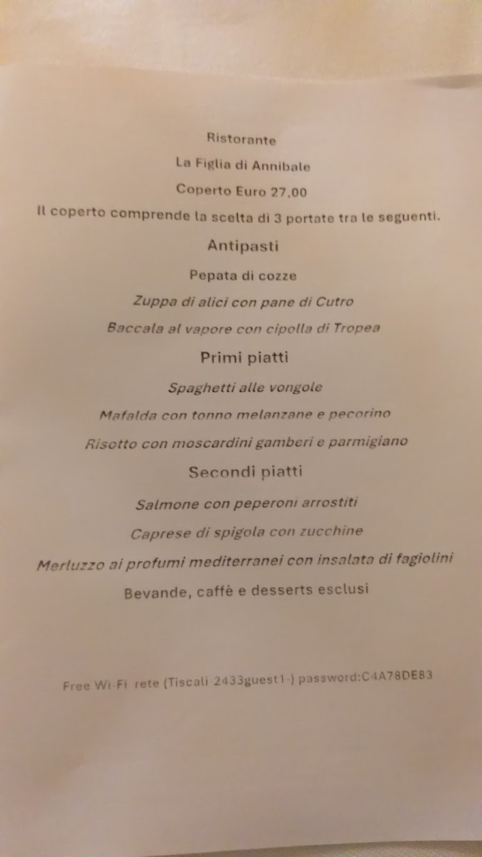 The menu at La Figlia Di Annibale reflects a confident balance between tradition and refined execution, with a strong focus on seafood and seasonal ingredients. Dishes like Pepata Di Cozze and Spaghetti Alle Vongole highlight the kitchen’s respect for classic Italian flavors, delivering clean, maritime notes that feel honest and well-judged. More elaborate plates such as Risotto Gamberi E Fiori Di Zucca and Spaghetti Al Nero Di Seppia show a thoughtful use of texture and color, where sweetness from seafood is carefully balanced with aromatic and vegetal elements. The pasta selection stands out for its variety and personality, from the bold, rustic character of Spaghettone Con Alici to the aromatic intensity of Tremola Arriganata, each dish maintaining a clear identity without unnecessary complexity. On the appetizer side, Caprese Di Branzino Con Cuore Di Zucchine and Fave Cicorie E Gamberi demonstrate a lighter, more contemporary approach, combining freshness and balance while still feeling rooted in local culinary culture. Main courses like Involtini Di Pesce Spada In Cuore Di Limone reinforce the restaurant’s seafood-driven philosophy, offering bright citrus notes that elevate the natural flavor of the fish. To close the experience, the dessert Tartufo Alla Nocciola Con Cuore Di Fichi provides a rich yet controlled sweetness, pairing nutty depth with a soft fruity center, while a simple Caffe brings the menu to a classic Italian finish. Overall, the menu feels cohesive and purposeful, with each highlighted dish contributing to a well-rounded and memorable dining experience centered on quality ingredients and clear flavors.